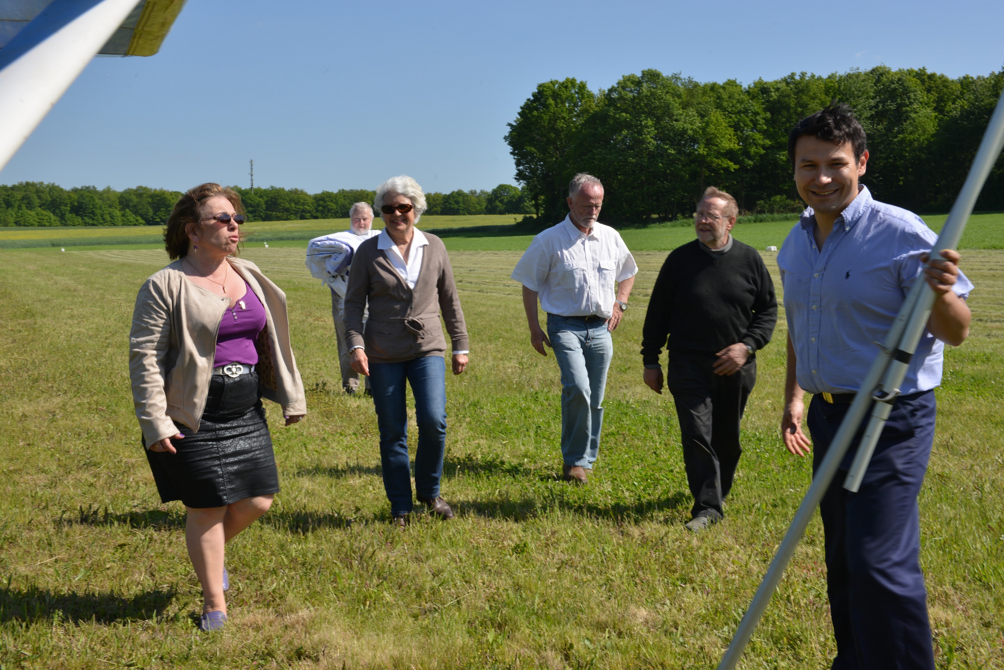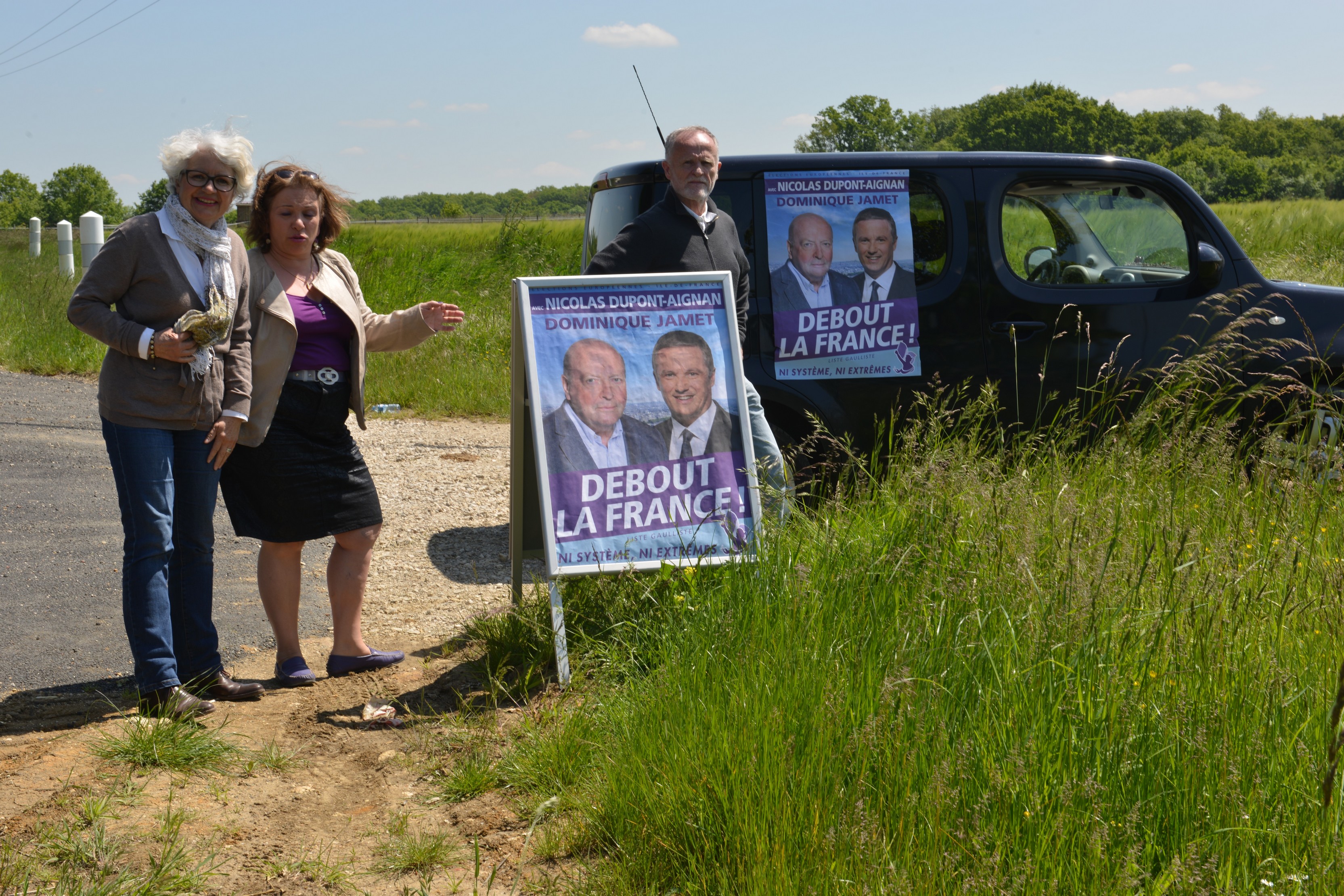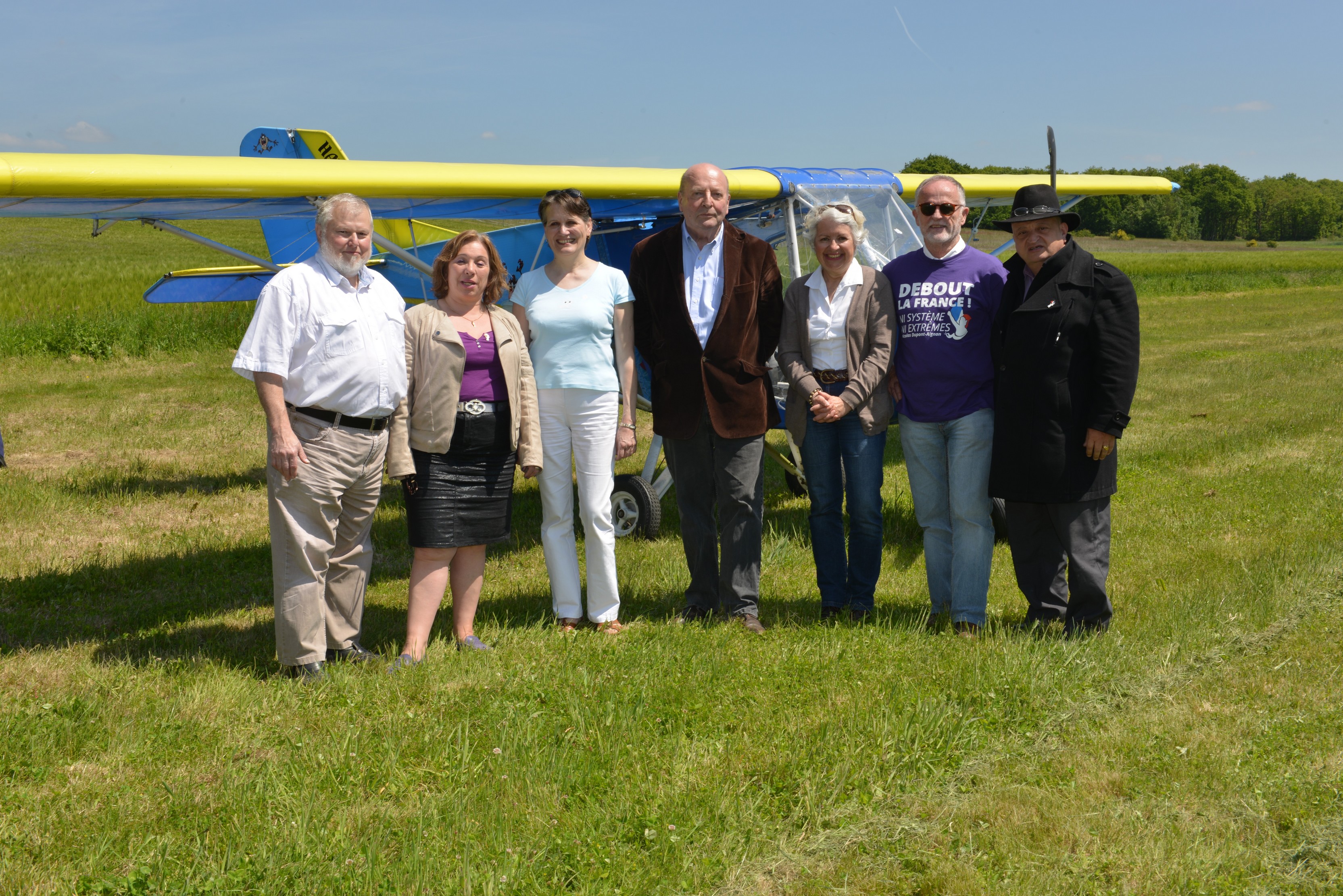 Dominique Jamet, tête de liste DLF de la circonscription Ile de France, accompagné par des militants, est venu à l'aérodrome d'Emancé, près de Rambouillet, le vendredi 16 mai, assister au décollage de la caravane aérienne de "Debout La France" en présence des médias.
