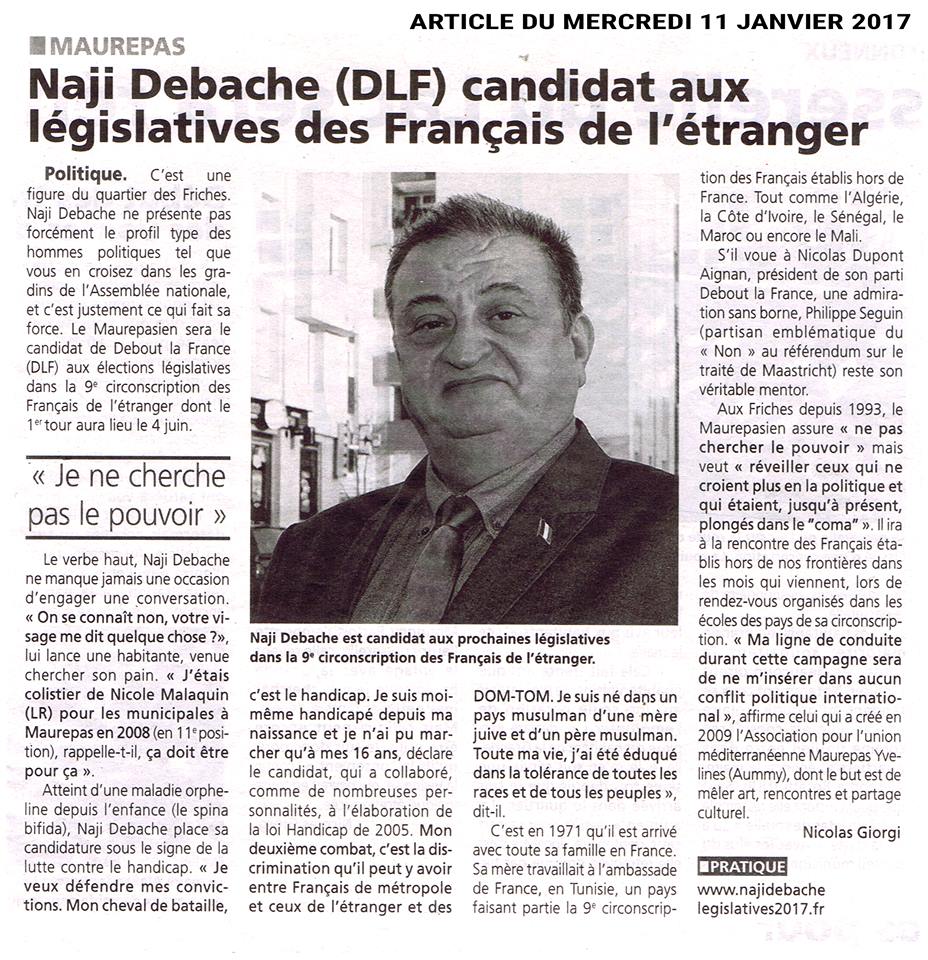Le mercredi 11 janvier 2017, ce journal consacrait un article à Naji Debache, adhérent DLF78 de Maurepas, qui se présente aux législatives 2017 au nom de Debout La France dans la 9è circonscription des Français de l'étranger. Cliquez sur l'article pour le lire.
