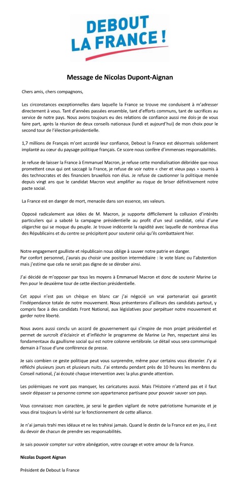 - Prise de position de NDA pour le 2è tour (28/04/17) maj du 03/05/17