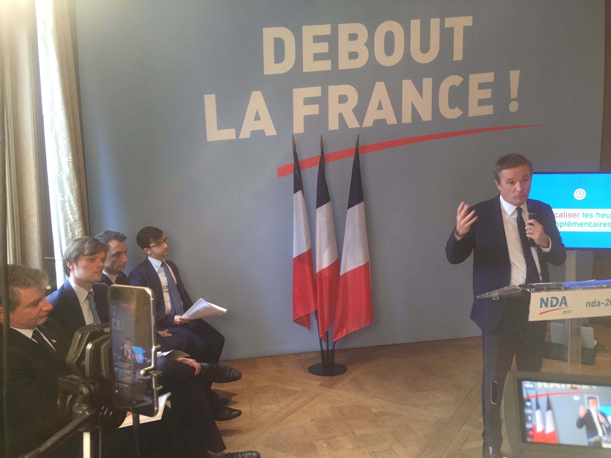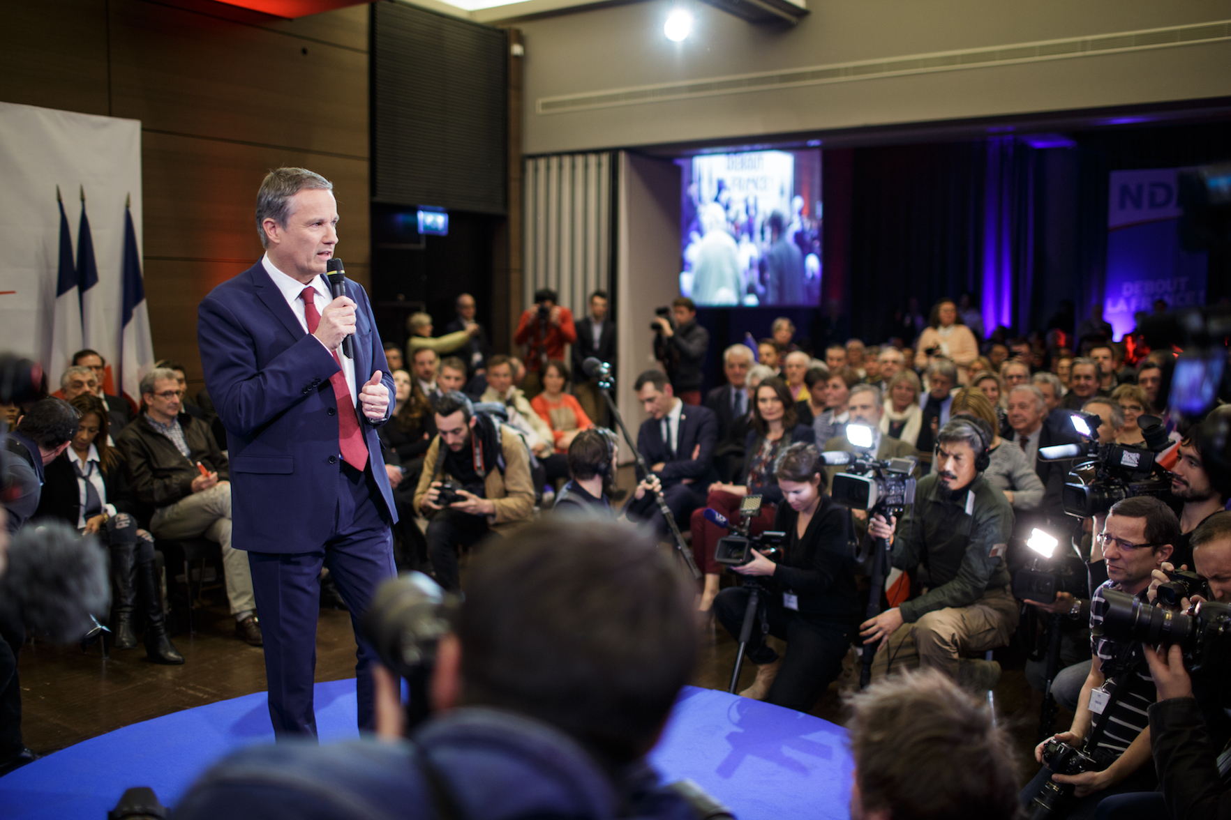 Le Jeudi 17 mars 2016, Nicolas Dupont-Aignan, candidat à l'élection présidentielle 2017, réunissait les militants de Debout La France pour sa première réunion de campagne.
