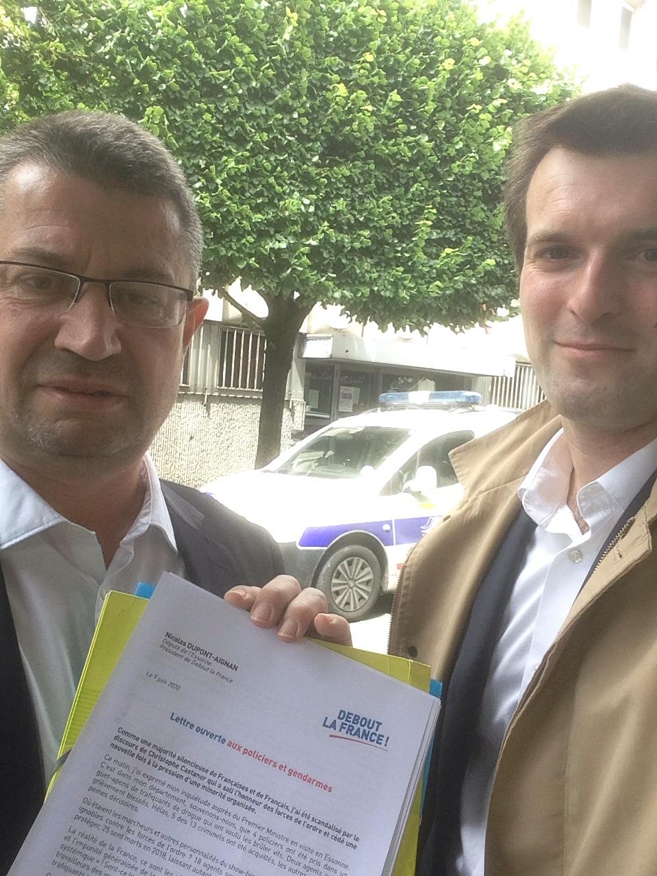 Ce vendredi 12 juin, Thibault Tournier et Olivier Gallant, cadres de la fédération des Yvelines de Debout La France se sont rendus au commissariat de Poissy pour remettre la lettre ouverte au policiers et aux gendarmes de Nicolas Dupont-Aignan (ci-jointe). Le commandant de secteur est venu à leur rencontre pour échanger sur la situation difficile que traversent les policiers. Les représentants de Debout La France ont signifié au policier que DLF les soutenait face aux délinquants, face aux accusateurs manichéens et face à leur ministre Christophe Castaner qui remet en cause leur professionnalisme. Le commandant, conscient du soutien de la population, s'est tout de même dit touché par le message d'encouragement porté par Debout La France.
